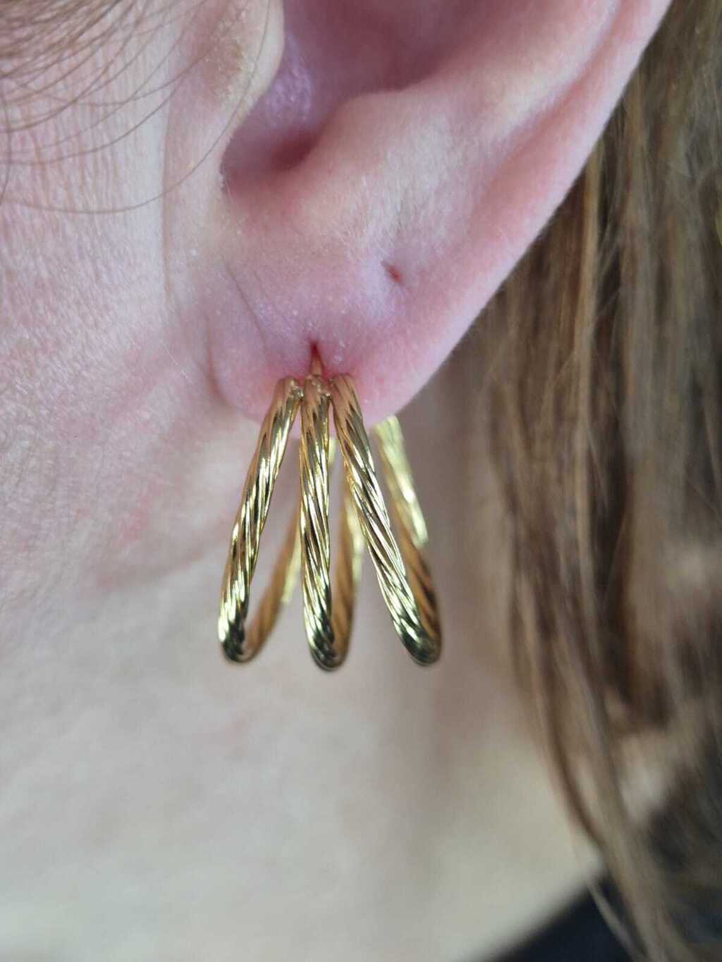 Design Exclusivo: Com seu acabamento em três listras delicadas, essa argola média proporciona um visual contemporâneo e sofisticado, perfeito para diversas ocasiões, do dia a dia a eventos especiais.