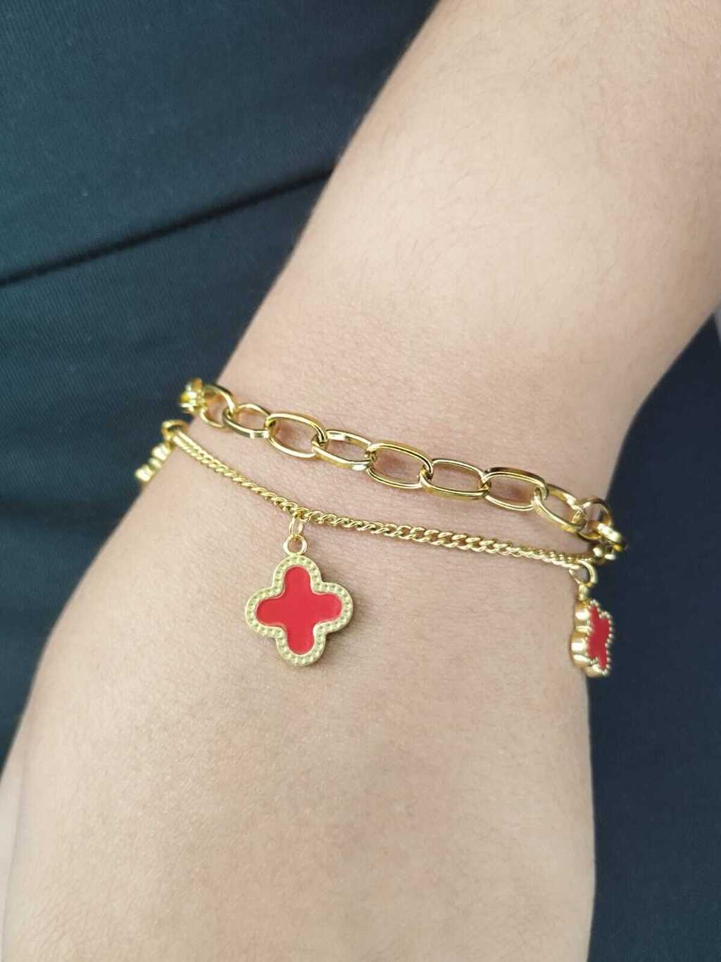 Na nossa loja, você encontra acessórios que unem design, qualidade e significado. Aproveite e eleve seu visual com a Pulseira Dupla Corrente com Trevo Resinado em Aço Dourado!