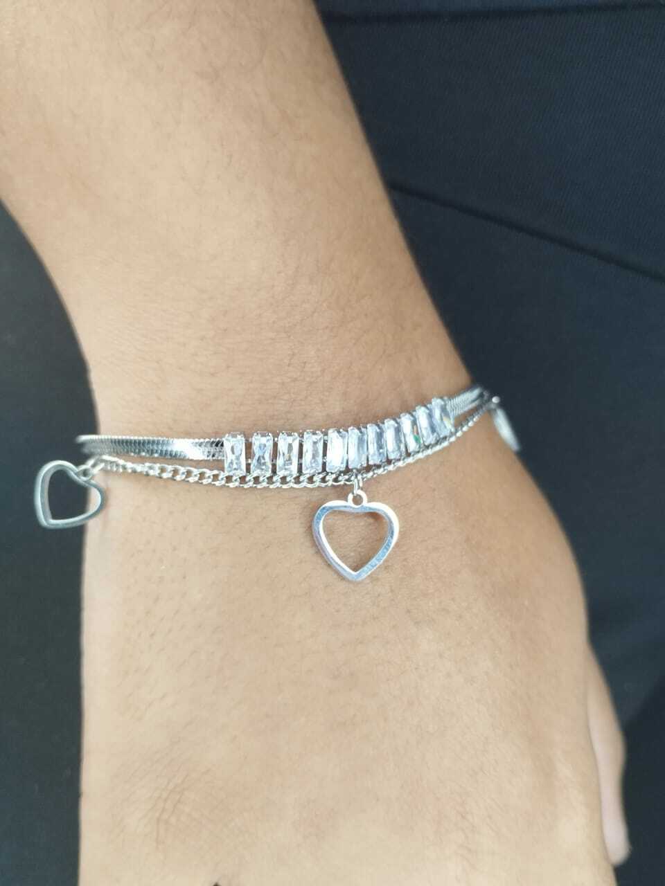 Na nossa loja, você encontra joias que unem qualidade, estilo e conforto para realçar sua beleza natural. Aproveite para adquirir a Pulseira Dupla Fita com Pedras e Coração Vazado em Aço Inox e transforme seu visual com um toque de elegância!