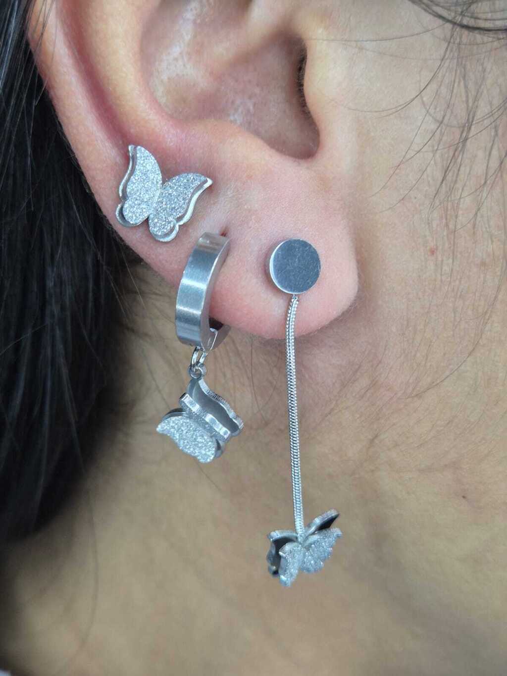 Descubra o charme e a delicadeza do Trio Borboleta 3D Brilhosa com Argolinha e Corrente em Aço Inox, um conjunto que une beleza, brilho e resistência para transformar seu visual com um toque feminino e moderno.
