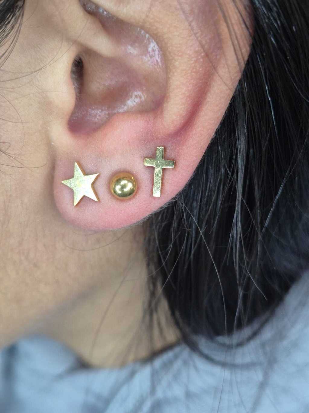 Descubra a beleza e a versatilidade do Trio Cruz P Estrela Chapa Bolinha em Aço Dourado, um conjunto de acessórios que traz elegância e um toque sofisticado para o seu visual.