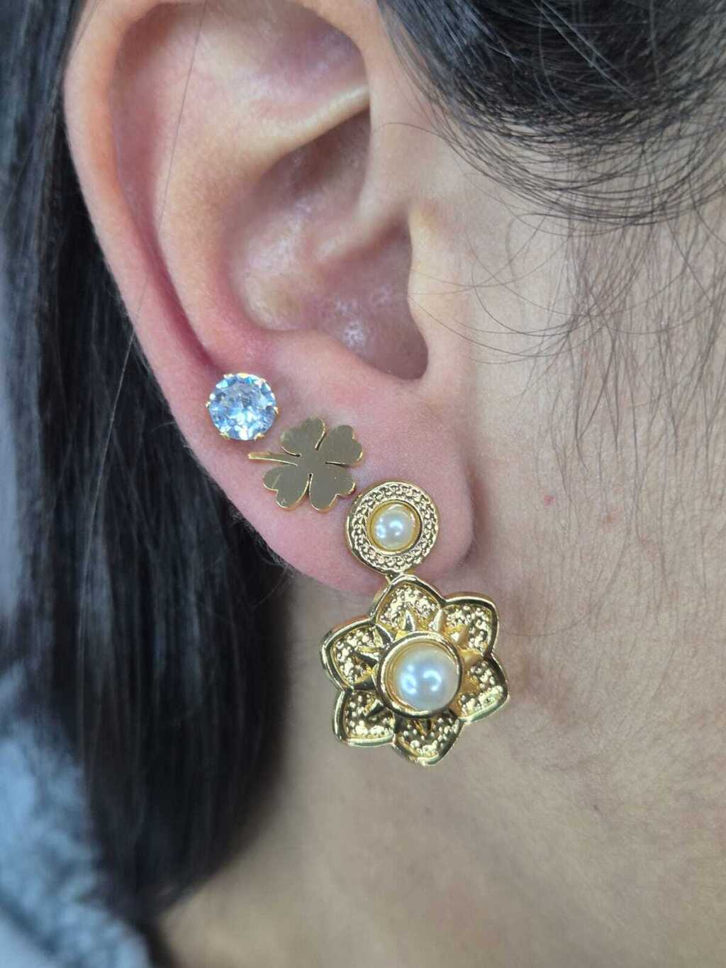 Trio Pedrinha Trevo e Flor com Pérola em Aço Dourado – Um toque de charme e sofisticação para seu visual!